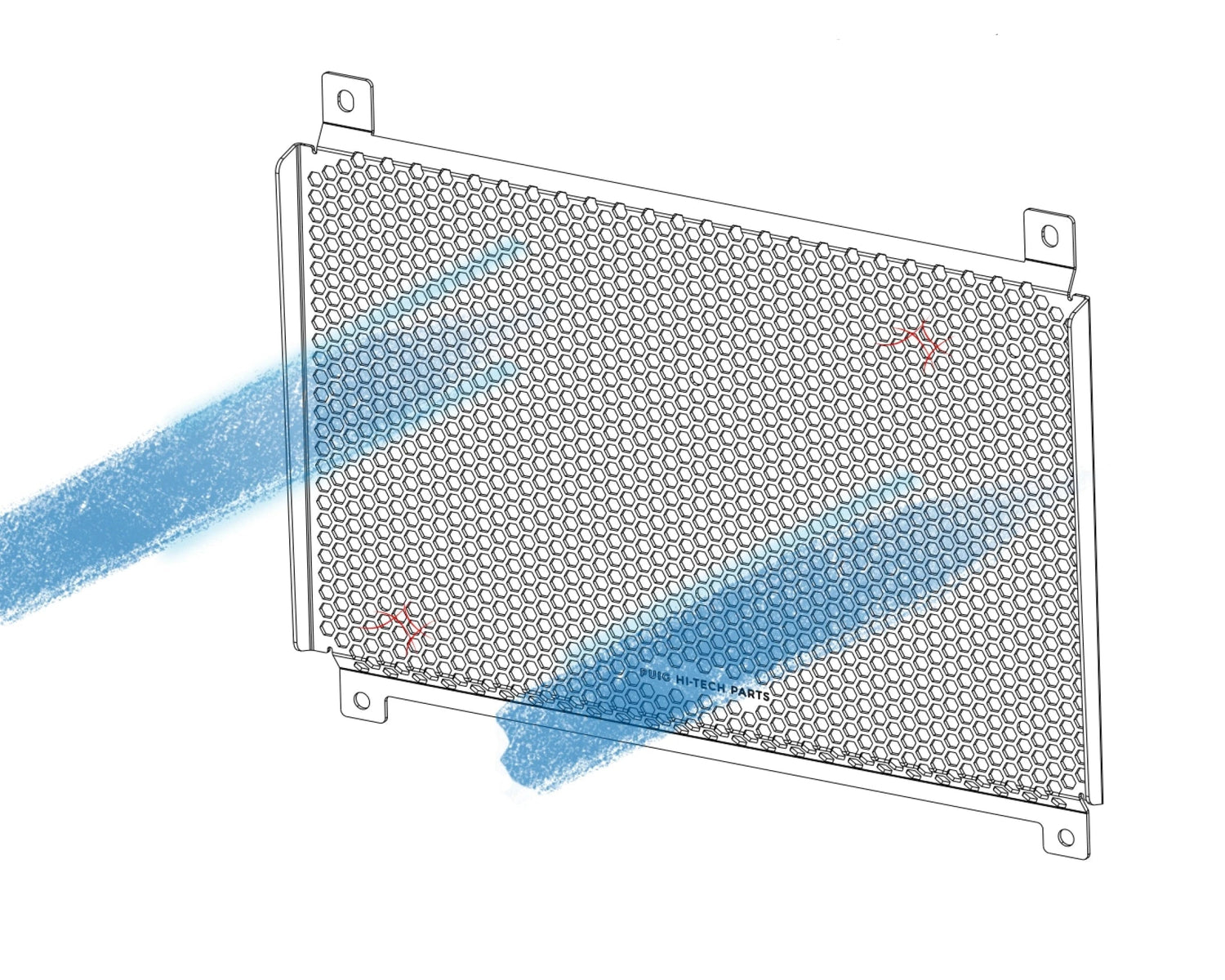 Crafted from lightweight but high-strength aluminium, the protector is finished with a textured black coating that not only improves durability against wear and oxidation but also enhances the bike’s aesthetics. Featuring a hexagonal mesh design, it provides maximum airflow while offering robust protection. Anti-vibration rubbers are integrated into the design to prevent unnecessary movement and ensure a secure fit.