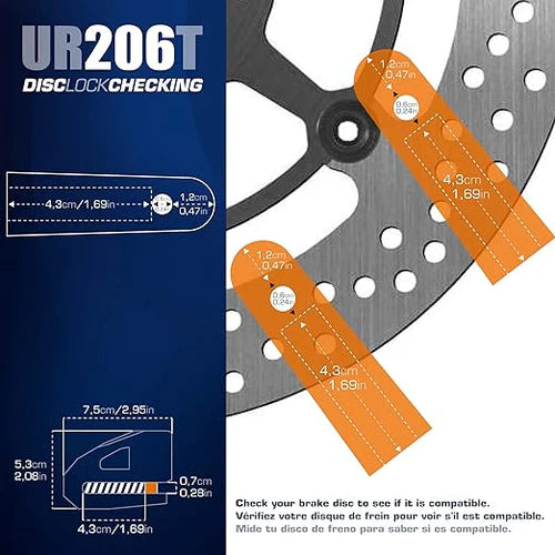 The Urban Security UR206T Disc Lock is a practical, everyday security option for scooters and motorcycles. Designed with a 6 mm hardened steel locking pin, it is suitable for brake discs with smaller outer holes. If your motorcycle has larger inner disc openings, the UR208T with a 10 mm pin may be more appropriate.